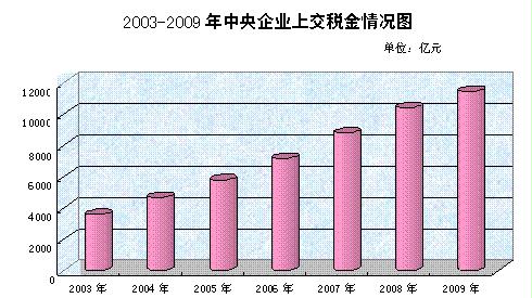 四、上交税金情况。2009年中央企业实际上交税金总额11474.8亿元(含石油特别收益金680亿元),比上年增长10.1%,比2003年增加7911.7亿元,六年间年均增加1318.6亿元,年均递增21.5%。在全部上交税金中,增值税3782.3亿元,占上交税金总额的33%;企业所得税2203.7亿元,占19.2%;消费税2071.9亿元,占18.1%;营业税1050.2亿元,占9.2%;石油特别收益金680亿元,占5.9%。2009年实际上交税金总额超过百亿元的中央企业有23家,比上年增加1家,比2003年增加15家。
