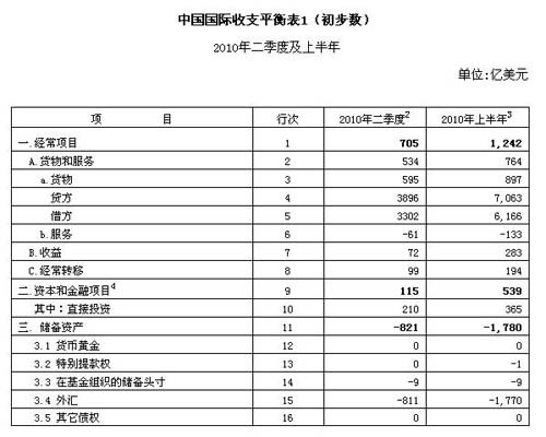 据介绍,2010年上半年,我国国际收支经常项目顺差1242亿美元,同比下降8%,经常项目顺差占GDP的4.9%,同比下降1.3个百分点;资本和金融项目顺差539亿美元(含净误差与遗漏);国际储备资产增加1780亿美元,同比增长8%。