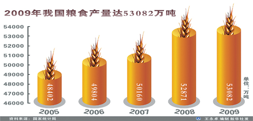 2004年以来,中国粮食连续6年增产,去年粮食总产量达到10616亿斤,比2003年增产2002亿斤,粮食自给率保持在95%以上。