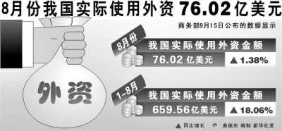 据商务部公布,2010年1至8月,全国新批设立外商投资企业16721家,同比增长18.33%,实际使用外资金额659 .56亿美元,同比增长18.06%。《经济参考报》记者注意到,从今年3月以来,我国吸收外资金额一直保持着两位数的高速增长,8月同比增长1.38%为近6个月来的最低增幅,仅稍高于存在春节因素的2月。