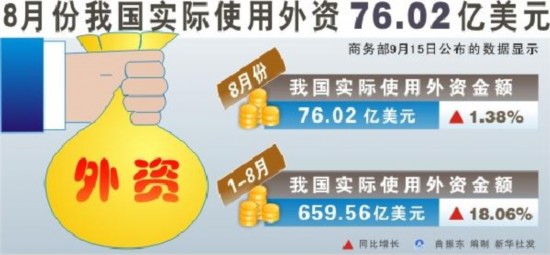 新华网北京9月15日电(记者王希)商务部15日公布的数据显示,8月份全国实际使用外资76.02亿美元,同比增长1.38%。前8个月,我国累计吸收外资659.56亿美元,同比增长18.06%。
