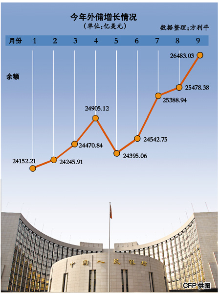 数据显示,9月末,国家外汇储备余额为26483亿美元,第三季度,外汇储备新增1840.25亿美元,增长规模创下季度新高,规模达到整个上半年的3.3倍。7、8、9月新增外汇储备分别达846.19亿、89.44亿和1004.65亿美元,其中7月和9月,分别创下单月历史最高和次高水平。