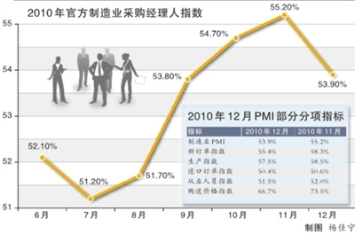 昨天,中国物流与采购联合会公布2010年12月官方制造业采购经理指数(PMI)为53.9%,较11月回落1.3个百分点,这是该指数在连续四个月上升后首度回落。目前该指数继续保持在较高水平,显示出当前经济增长态势基本平稳。值得注意的是,此前一直上涨的购进价格指数12月出现明显回落,显示在政策作用下物价水平有所回落。