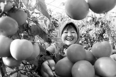 陕西省靖边县东坑镇黄家峁村村民高俊梅正在自家的温棚里采摘西红柿。她家16个大棚里种植的反季节蔬菜每棚收入达2万元。新华社记者 陶 明摄