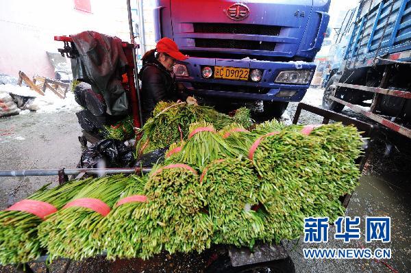 长沙市马王堆蔬菜批发市场的商贩在整理蔬菜(1月19日摄)。连日来,湖南长沙遭遇罕见冰雪天气,市区持续低温。当地蔬菜供应充足,价格基本保持稳定。 新华社记者 龙弘涛 摄