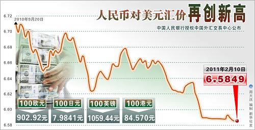 中国外汇交易中心昨日公布,2月10日人民币对美元汇率中间价报6.5849,较前一交易日微涨1个基点,再次创下了2005年汇改以来的新高。而9日人民币对美元的中间价则较农历新年前最后一个交易日走高10个基点。记者统计,2011年以来,人民币累计升值已达0.57%。