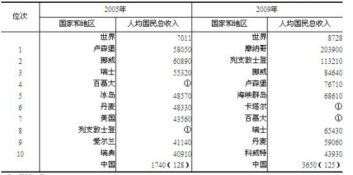 2005年和2009年中国与世界前十位国家和地区人均国民总收入比较 单位:美元 注:①无数据,近似排位。 来源:国家统计局网站