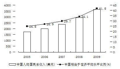 2005-2009年中国人均GNI及相当于世界平均水平的比例