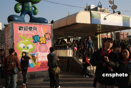 图为台北捷运站出入口强力推介消费券的广告。中新社发 陈立宇 摄