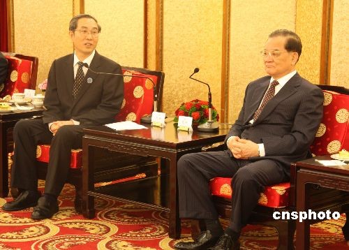 广西壮族自治区主席马飚五月二十一日率领广西经贸文化代表团乘坐包机飞抵台湾,他是大陆第一个率团赴台进行经贸文化交流的正省级官员,此行是海峡两岸交流史上的新突破。国民党荣誉主席连战(右)在台北圆山饭店会见马飚(左)主席一行。 中新社发 耿军 摄