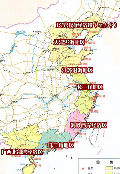 值得指出的是,在这些区域规划中,天津滨海新区、江苏沿海地区、海峡西岸经济区、广西北部湾经济区等,均是改革开放以来沿海地区发展中的薄弱环节,属于新的战略部署;而作为中国经济最活跃的两大沿海板块——长三角和珠三角,则是再次被重新部署,赋予其全新的发展诠释。