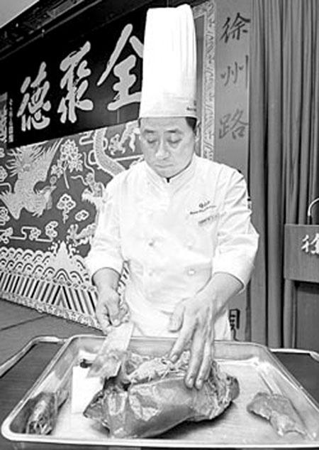 这几天,台湾饕客们可过足瘾了,芥末鸭掌排成的火炬、乌参变成龙舟身、水晶鸭舌模仿成水立方……6月30日开始,北京全聚德在台举办美食节,除了皮肥肉嫩的烤鸭,还带来了2008年北京奥运特色餐点。11位技术人员亲自为岛内民众献技,师傅现场表演片鸭时,1.6公斤左右的烤鸭,连皮带肉一口气片出90多片,引来台下阵阵叫好。