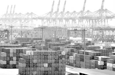 上海洋山深水港码头一景。上海市交通运输和港口管理局发布的数据显示,预计2009年上海港的货物吞吐量将完成5.8亿吨,基本与上年持平。新华社 陈飞 摄