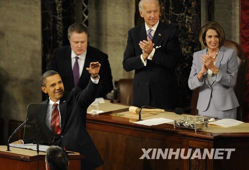 奥巴马首次发表国情咨文 1月27日,在美国首都华盛顿国会山,美国总统奥巴马(前)发表国情咨文讲话。这是奥巴马就任总统以来首次发表国情咨文。新华社记者 张军 摄