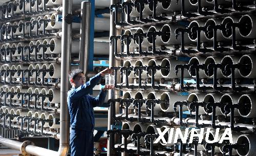 然而,在持续负增长的背景下,山西做出了“黑”转“绿”的抉择,坚决淘汰落后产能。2009年上半年,万元工业增加值能耗下降7.92%,万元GDP电耗下降8.54%,二氧化硫减排量超额完成了“十一五”目标。 在太原钢铁(集团)有限公司的污水处理作业区,一名工人正在取样。新华社记者 燕雁摄