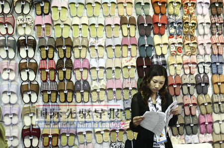 一家制鞋企业的工作人员在3月的中国华东进出口商品交易会展位内清点商品。本报记者 裴鑫/摄
