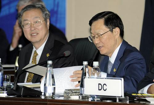 6月5日,中国财政部部长谢旭人(右)和中国人民银行行长周小川(左)出席在韩国釜山举行的二十国集团财长和央行行长会议。当日,二十国财长和央行行长会议在韩国釜山继续举行。 新华社发