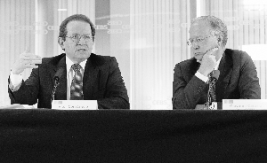 7月23日,欧洲银行业监管委员会主席乔瓦尼·卡罗西奥(右)和欧洲央行副行长维托尔·康斯坦西奥在英国伦敦出席新闻发布会。