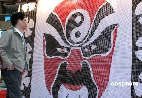 十二月二十一日,规模空前的台北建筑建材暨产品展继续在台北世贸展馆举行。图为一家业者用一公分乘一公分大小的马赛克瓷砖,拼成一幅巨大京剧脸谱,吸引不少民众的目光。中新社发 董会峰 摄