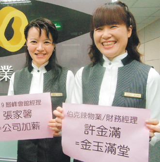 许金满说,一直觉得自己的名字很“俗”,“现在爱死这个名字!”同事也希望她能为公司日进斗金。张家馨更受同事欢迎,每天冲着她喊“加薪、加薪”。