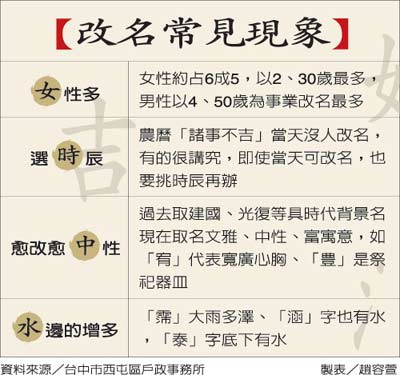 台中市去年平均每月有617人改名,改名潮延续到今年人数有增无减,2月就有728人改名。户政人员发现,不少人因失业、放无薪假、工厂倒闭等原因改名,“大家想改名换好运!”