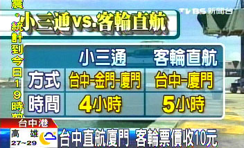 和“小三通”相比,客轮直航不用绕到金门换乘,航程相差1小时,但价格至少便宜1000元,缺点是因为目前以旅行团为主,客轮班次不多,平均6天一趟来回。华达海运公司董事长董事长焦仁和表示,“很快地,希望能够在这个夏天,在这个旅游旺季的时候,我们取得定期航权。”