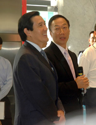 据“中央社”报道,郭台铭今天下午四时,在位于台北县土城市的鸿海精密公司,亲自迎接马英九的到来。一进入公司大厅,郭台铭向马英九介绍张贴在大厅梁柱的一幅对联。