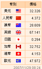 台币汇率公告2007.11.29
