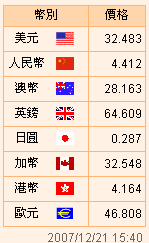 台币汇率公告2007.12.21