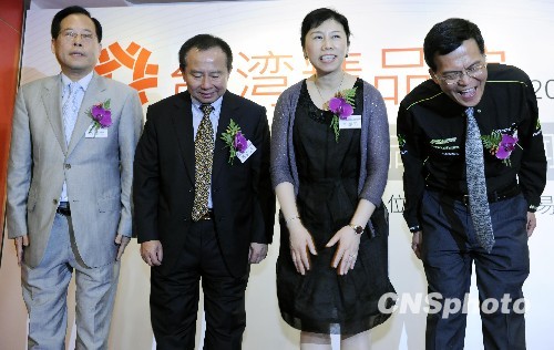 5月26日,台湾高科技知名品牌的企业领导人在北京举行新闻发布会,介绍即将在第十三届中国北京国际科技产业博览会上亮相的的“台湾精品馆”。图为台北世界贸易中心处长李惠玲女士(右二)、友讯科技公司执行长曹安邦(左二)、美利达公司总经理许世彦(右一)和雷虎科技公司董事长赖春霖(左一)等出席仪式。 中新社发 刘震 摄