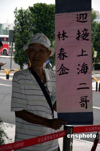 两岸周末包机七月四日启程,台湾社会各界关注。二十岁来到台湾的老伯林振凤一大早从台南赶到台北松山机场,接搭乘两岸周末包机八十四岁的二哥林春金。这将是林振凤老人自十六年前台湾当局开放到大陆探亲后,他再次与兄弟相见。 中新社发 徐长安 摄