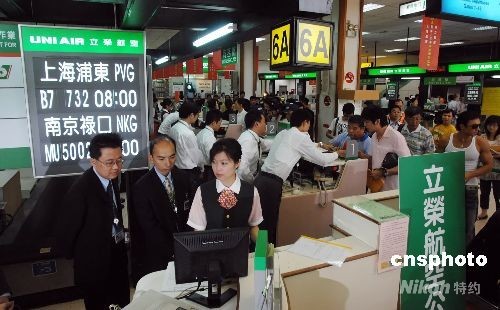 7月4日,台湾立荣航空首班周末包机上午八时首航台北到上海,台湾松山机场柜台看板首次显示出目的地上海。 中新社发 CNA 摄