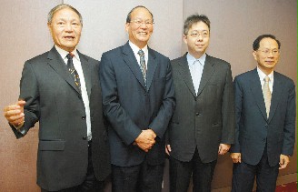 台湾海运四大巨头正利董事长周家献(左)、阳明海运董事长卢峰海(左二)、万海董事长陈柏廷(右二)、台航董事长张义源(右)28日齐聚一堂,谈两岸海运直航对产业发展的重要性。(图片来源:台湾《联合晚报》)