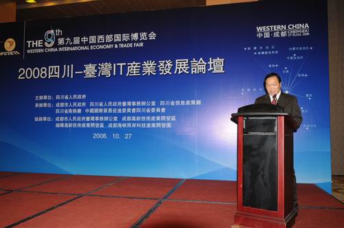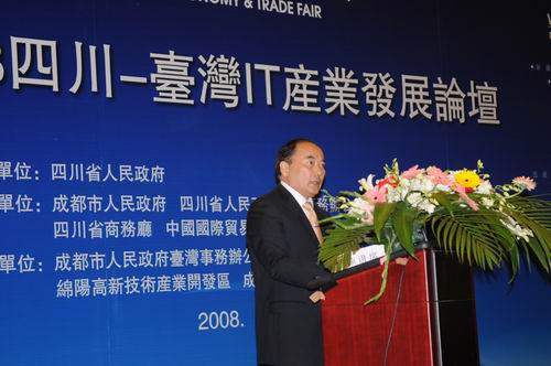 杨志文副主任在论坛上致辞,他说,地震后,台湾同胞表现出来的与四川人民患难与共的手足亲情让人感动。四川是西部地区IT产业聚集地,有雄厚的产业基础、丰富的人才资源,又面临承接产业转移的重大机遇。川台IT界的合作,一定能优势互补,实现双赢。徐扬向与会嘉宾介绍,地震对四川信息产业未造成大影响,今年1至9月的相关产业的销售达到1118亿元,同比增长32%,其中软件业销售378亿元,同比增长39%。台湾知名企业认为,尽管经历了地震,但四川仍然是一片投资热土,专程参会的台湾首富郭台铭也表示已经决定在四川投资。
