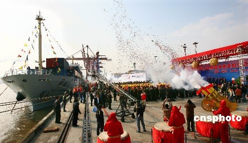 12月15日上午,由福建省人民政府、国台办、交通运输部共同举办的海峡两岸海上直航福州港首航仪式在福州港青州港区举行。据悉,当日,福建全省沿海首航的有10艘船舶,分别从福州港、厦门港、泉州港开往高雄港、基隆港、台北港、台中港、布袋港。由福州港开出的共有4艘船舶分别为:华航3号、吉祥山号、金海缘号、兴华号。据了解,福建省政府、国台办、交通运输部、福州市领导和福建省直有关部门、福州市直有关部门、口岸联检各单位的领导,以及首航船公司、码头公司、从事试点直航、两岸三地弯靠及“小三通”客货船公司的代表、台湾船公司及驻榕办事处代表等共500多人参加了首航仪式。 中新社发 祝敏松 摄