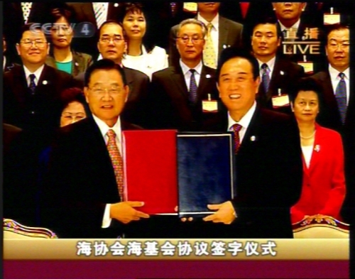 海协会会长陈云林与海基会董事长江丙坤签署协议。26日下午三时许,海协会会长陈云林与台湾海基会董事长江丙坤在南京紫金山庄正式签署《海峡两岸空运补充协议》、《海峡两岸金融合作协议》、《海峡两岸共同打击犯罪及司法互助协议》。(中国台湾网 钟宝华 摄)