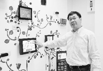 台湾新大陆资讯科技公司总经理阎蔚中介绍新产品。