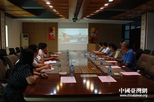 鹏程实业有限公司管理人员陪同台企转型升级服务团及专家观看企业宣传片。(中国台湾网 胡珊珊 摄)