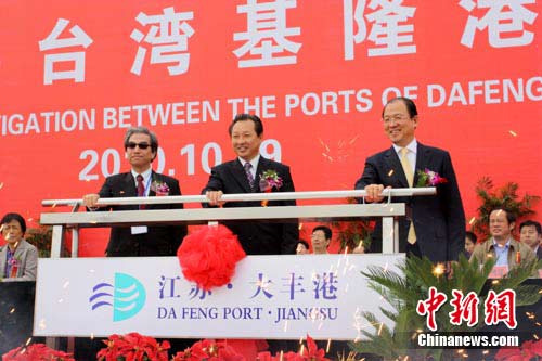 19日上午11时18分,随着中共盐城市委书记赵鹏一声宣布,盐城地方政府官员与台湾基隆港物流协会会长共同启动拉杆,一艘“宝宏8号”货轮缓缓离岸驶向台湾基隆港,江苏大丰港与台湾基隆港实现首次直航。