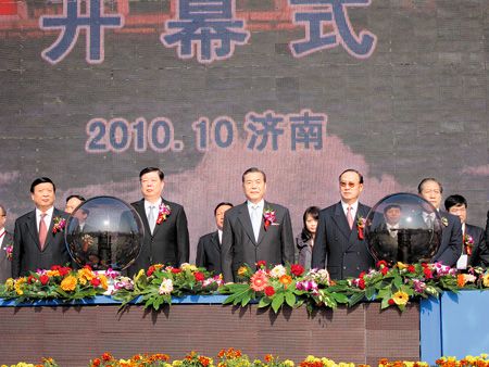 “2010年山东台湾名品博览会”昨日在山东济南展开,山东省委书记姜异康(左二)和台湾外贸协会董事长王志刚(右三)共同出席开幕典礼。图片来源:台湾中国时报