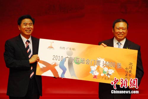 8月17日,“台湾·广东周”开幕式在台北国际会议中心举行,广东省省长黄华华率领一个千人大型经贸文化代表团出席。图为开幕式上黄华华省长代表亚组委向台湾赠送一万张亚运门票。中新社发 梁永强 摄