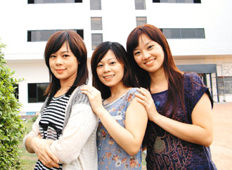 台湾牛仔裤业界知名单身美女董事长陈羿伶(中),10月10日要在公司新建的两岸牛仔裤物流中心举办文定喜宴。7日她与姊妹一起验收物流中心工程。图片来源:台湾《联合报》