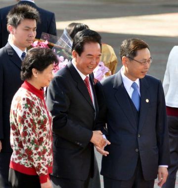 大陆海峡两岸关系协会会长陈云林等人,20日中午搭机抵达桃园机场。陈云林直接下机,他向守候媒体及接机人员挥手。台湾海峡交流基金会副董事长高孔廉等人前往接机,现场并有大批媒体守候。 “中央社”图
