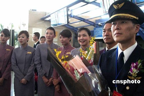 十二月十五日上午十点十分,满载着十三名机组人员和三百一十三名旅客的台湾地区中华航空CI七九八九航班飞抵浙江杭州萧山机场。图为机组人员受到热利润欢迎。 中新社发 周翌 摄
