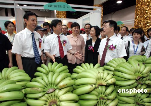 “2007台湾优质农产品巡回展览”7月20日在上海开幕,农业部副部长尹成杰(左)、国台办副主任叶克冬(右)、上海市副市长胡延照(中)等参观展览。该展览是由海峡两岸农业交流协会与台湾省农会共同主办,旨在进一步推进海峡两岸农业交流与合作,七月二十日至二十五日分别在上海、南京、福州、武汉、广州、大连等地举办,主展场设在上海农业展览馆。中新社 潘索菲摄
