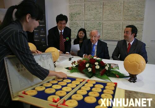 7月18日,甘肃农民查泰山(左二)将工艺体育葫芦制品作为生日礼物送给萨马兰奇。2008年7月17日是国际奥委会终身名誉主席萨马兰奇88岁的生日。7月18日,在中国收藏家协会的组织下,“工艺体育葫芦”发明人、甘肃农民查泰山在西班牙巴塞罗那为萨马兰奇先生祝寿,送上珍贵的生日礼品——“工艺体育葫芦”(葫芦足球、篮球、排球等)。 新华社发