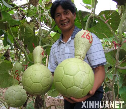 2008年7月17日是国际奥委会终身名誉主席萨马兰奇88岁的生日。7月18日,在中国收藏家协会的组织下,“工艺体育葫芦”发明人、甘肃农民查泰山在西班牙巴塞罗那为萨马兰奇先生祝寿,送上珍贵的生日礼品——“工艺体育葫芦”(葫芦足球、篮球、排球等)。图为甘肃农民查泰山在展示其培育的葫芦足球(6月28日摄)。 新华社发
