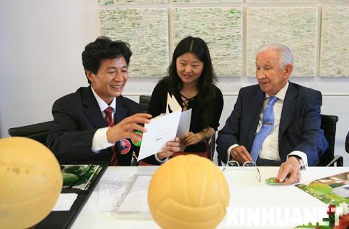7月18日,甘肃农民查泰山(左)与萨马兰奇交谈。2008年7月17日是国际奥委会终身名誉主席萨马兰奇88岁的生日。7月18日,在中国收藏家协会的组织下,“工艺体育葫芦”发明人、甘肃农民查泰山在西班牙巴塞罗那为萨马兰奇先生祝寿,送上珍贵的生日礼品——“工艺体育葫芦”(葫芦足球、篮球、排球等)。 新华社发