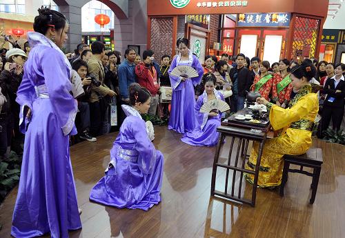 11月16日,茶艺小姐在第三届海峡两岸茶业博览会上表演茶艺。当日,第三届海峡两岸茶业博览会在福建省宁德市开幕。本届茶博会共有来自海峡两岸主要产茶区及欧盟、日本、俄罗斯、东南亚等600多家茶叶企业、近千名经销商赴会参展。博览会期间还将举办茶业国际高峰论坛、海峡两岸茶业交流研讨活动、国际禅茶文化研讨会等系列茶事活动。新华社记者 姜克红 摄