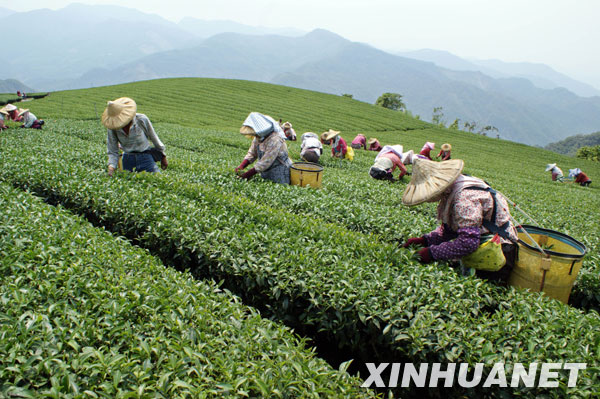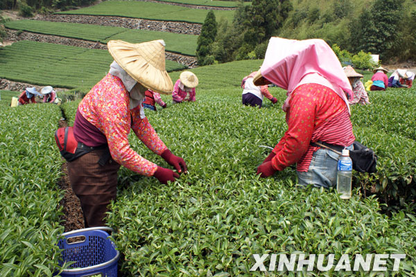 4月11日,阿里山茶农在高山茶园里采摘春茶。清明节过后正是台湾高山春茶的采收期,嘉义县阿里山乡茶农背着竹篓在茶园中穿梭,忙着采摘春茶。 新华社发